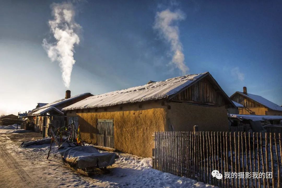 北极村晨曦拍摄:大雪把村子完全覆盖,小木屋露出淡淡的微黄,宁静而美好......