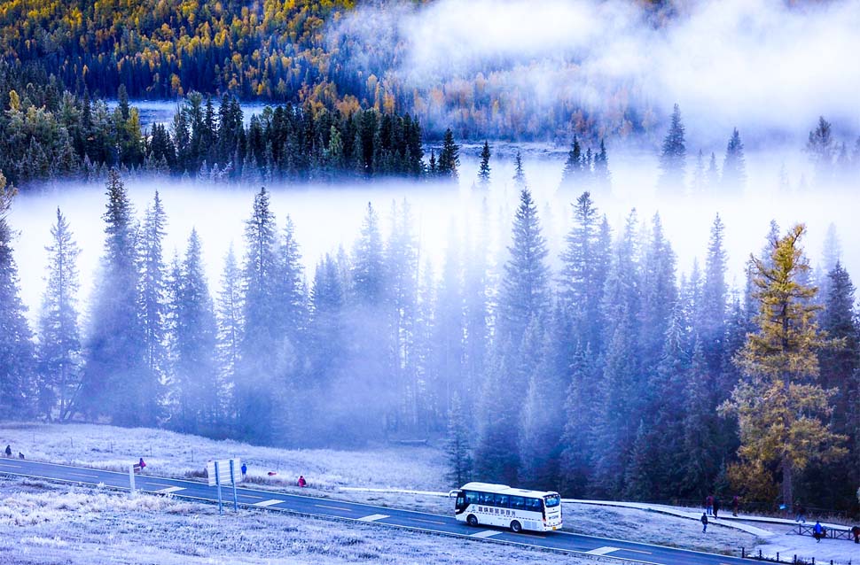 金黄色与火红色随意撒抹在一片片森林里,山顶白雪皑皑,谷底木屋错落有致。“卧龙湾、月亮湾、神仙湾”三湾在云雾缭绕中隐现;古老神秘的图瓦人,悠然漫步的牛羊群,掩映在云雾缭绕之中,宛若世外仙境。五彩滩梦幻般的落日,额尔齐斯河谷在余晖中色彩斑斓。还有秋季的喀纳斯牧区大群牛羊转场,行走于遮天蔽日尘雾之间,是摄影人乐此不疲创作的天堂。金秋的喀纳斯是一个人一生中一定要来一次的地方,而且是一定要在这里陶醉一回的地方。