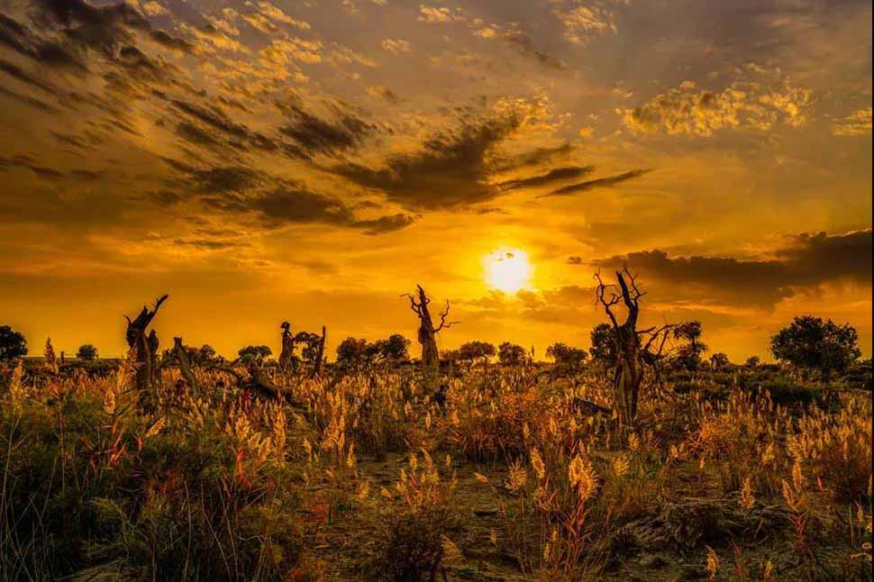 早餐后前往新疆木垒【平顶山】拍摄(含门票),万亩农田,麦苗青青,山峦起伏,山花烂漫,素有木垒县旱地粮仓之称,在这里,连绵丘陵地带如锦似秀,五光十色美轮美奂赏心悦目的乡村美景,山岳就象是一组宏大的五线谱,牛羊就像那跳动在五线谱上的音符,唱出的是牧民的欢歌!让人心旷神怡陶然而醉,这就是平顶山的神韵……,下午前往木垒【鸣沙山·胡杨林景区】(含门票),途中也可拍摄享有“地球第一响、木垒鸣沙山”之美誉的【鸣沙山】沙漠纹理曲线风光,后前往堪称“胡杨的大观园”及中国境内最古老的原始【胡杨林景区】自由创作,这里的胡杨由于环境恶劣,经过数千年的生长行程千姿百态,沧桑挺拔的造型,却仍然保持着古老的原始风貌。据说这片有大约30多平方公里的胡杨林至少有6500万年的历史。虽历经风雨沧桑,胡杨是一种生命力极顽强的原始树种,素被人类誉为抗击沙漠的勇士。树身高达20多米,注目端祥这些古树,有的像鲲鹏展翅、有的像骏马奔腾、有的像怀春的少女、有的像慈祥的老人,好不壮美,且有层层绿叶,形状各异或叶圆似卵,状态如柳叶,层层叠叠,密不透风,千姿百态,意趣横生。住:木垒