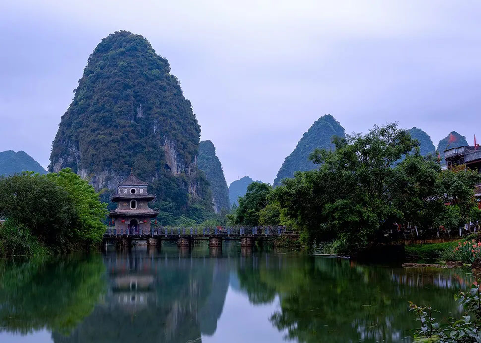 早餐后乘车前往靖西旧州,到达旧州午餐,后前往旧州老街(含门票)拍摄,旧州老街是全国闻名的绣球一条街,依河而建,石板地面,两边有众多古建筑,大青砖,厚木门。传承着壮族绣球文化,无论是街边的刺绣球的奶奶还是古老的文昌阁,以及这边独特的峰林田园风光都值得细细品味。这里以奇山秀水著称,是靖西风光的缩影。旧州一带奇峰秀美,山水如画,田园似锦,历史悠久,壮民族民俗风情浓郁,素有“壮族活的博物馆”之美誉。后走进“西南地区三大名泉之一”的鹅泉拍摄(含门票),这里有泉水边慢门、喀斯特山峰、翠竹、蓝天、白云倒影如镜,小桥流水,山水留韵,甚是清幽。体力好的可以攀登到半山亭俯瞰鹅泉全景,拍摄鹅泉全景。泉水由透明到绿色到蓝色,颜色丰富多彩,此处是德天瀑布的源头。鹅泉附近有个很有名的清朝十五孔桥,每当日落时分,光线透过孔洞,一片金黄,我们将我们在这里拍摄日落光影,拍摄期间安排暮归耕牛从清朝十五孔桥掠过精彩画面,好一派田园风情!住:那坡