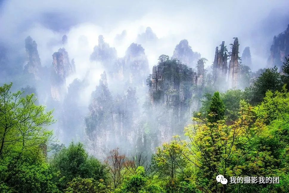 注:天子山是张家界核心景区(天子山海拔1262米,峰峦林立,云缠雾绕)必须拍摄的地方,因为这里涵盖了张家界石音峰林的所有特点,同时也是产生云海和雾海最多的景区,拍摄日出和日落的最佳地就在这里。