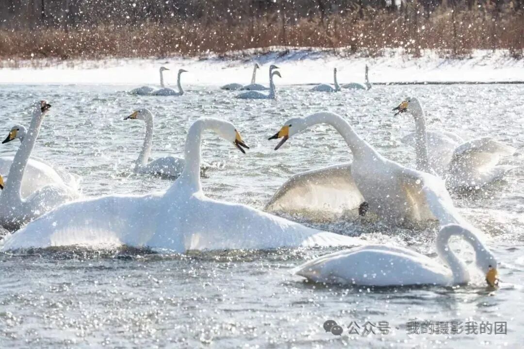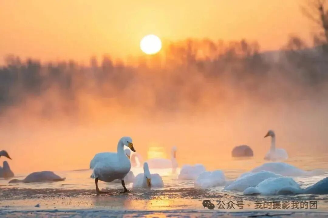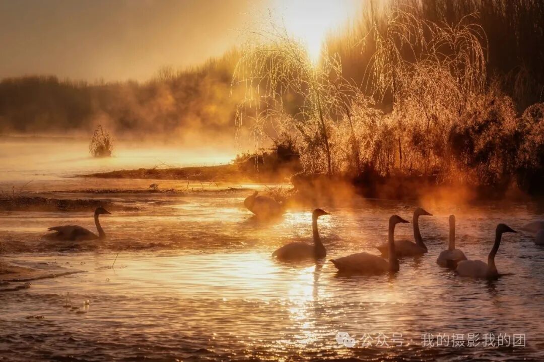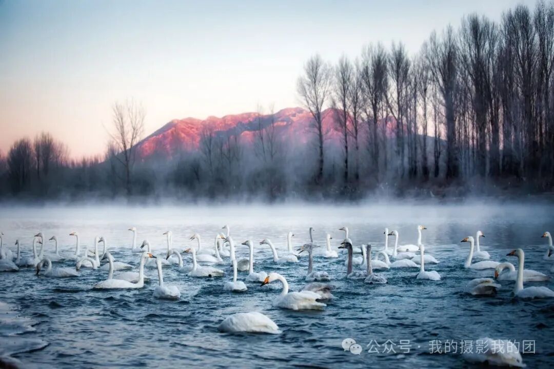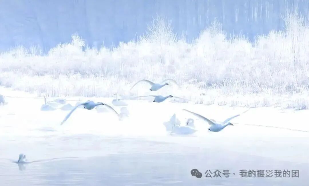 早前往杨柳湾拍摄雾凇、光影下的天鹅倩影,当晨曦缓缓升起,远方水面白天鹅在冰河中的身影渐渐显现,有的振翅鸣叫翩翩起舞、有的列队出游、有的踏水追逐、有的入水嬉戏觅食打闹、有的展翅高飞遨游天际等优雅的身姿,享受着清晨的惬意时光。流经杨柳湾的大凌河是一条不冻河,当昼夜气温变化骤降至零下15度以下,河岸两边的树梢和杂草,就挂上晶莹剔透的雾凇,仿若染就一树繁花,如梦如幻,恍若仙境,而这仙境并不只是静止的画面,有白天鹅在冰河中引吭高歌,正演绎着唯美的冬日恋歌。白雪、白凇、白天鹅,红霞、红波、红太阳,情景交融,相映相衬,为这湾冰河碧水增添了无限的生机与活力,构成了一幅幅雾凇和天鹅同框的绝美画面。下午前往牤牛营天鹅驿站创作,这里也是天鹅的最佳机位之一,这里可以近距离拍摄观赏到天鹅的优雅与灵动。它们煽动翅膀时,犹如芭蕾舞者般舒展与灵动。投食时,则从容淡定。美丽的身姿,高雅的气质,又是如此近距离的用此起彼伏的相机、手机快门声将天鹅最美瞬间尽收。这些白色精灵在这里与人们和谐共处,成为北票一道靓丽的风景线。住:朝阳