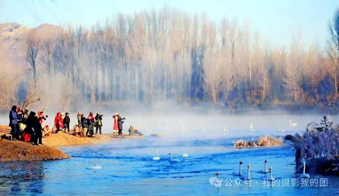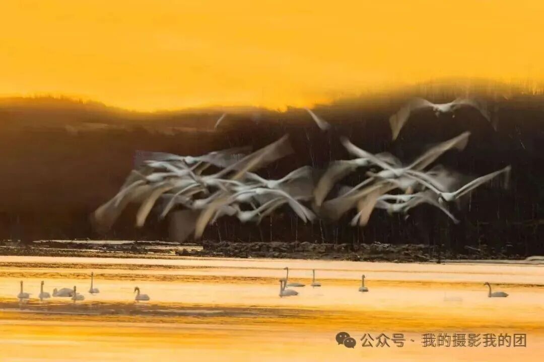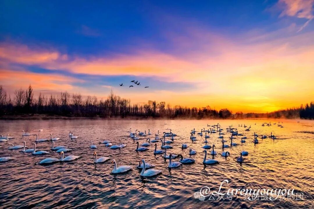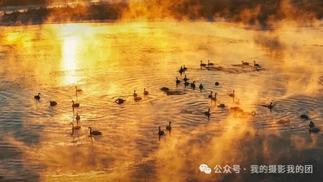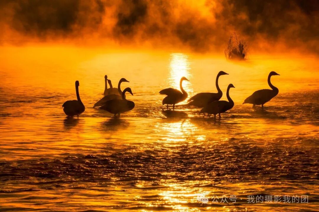 早前往杨柳湾拍摄雾凇、光影下的天鹅倩影,当晨曦缓缓升起,远方水面白天鹅在冰河中的身影渐渐显现,有的振翅鸣叫翩翩起舞、有的列队出游、有的踏水追逐、有的入水嬉戏觅食打闹、有的展翅高飞遨游天际等优雅的身姿,享受着清晨的惬意时光。流经杨柳湾的大凌河是一条不冻河,当昼夜气温变化骤降至零下15度以下,河岸两边的树梢和杂草,就挂上晶莹剔透的雾凇,仿若染就一树繁花,如梦如幻,恍若仙境,而这仙境并不只是静止的画面,有白天鹅在冰河中引吭高歌,正演绎着唯美的冬日恋歌。白雪、白凇、白天鹅,红霞、红波、红太阳,情景交融,相映相衬,为这湾冰河碧水增添了无限的生机与活力,构成了一幅幅雾凇和天鹅同框的绝美画面。下午前往牤牛营天鹅驿站创作,这里也是天鹅的最佳机位之一,这里可以近距离拍摄观赏到天鹅的优雅与灵动。它们煽动翅膀时,犹如芭蕾舞者般舒展与灵动。投食时,则从容淡定。美丽的身姿,高雅的气质,又是如此近距离的用此起彼伏的相机、手机快门声将天鹅最美瞬间尽收。这些白色精灵在这里与人们和谐共处,成为北票一道靓丽的风景线。住:朝阳