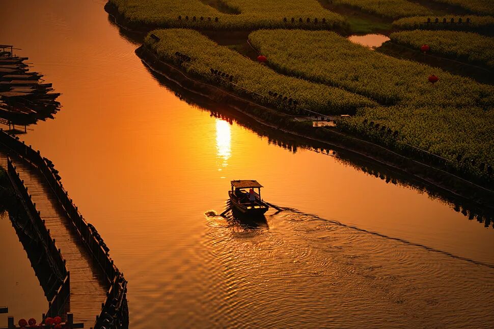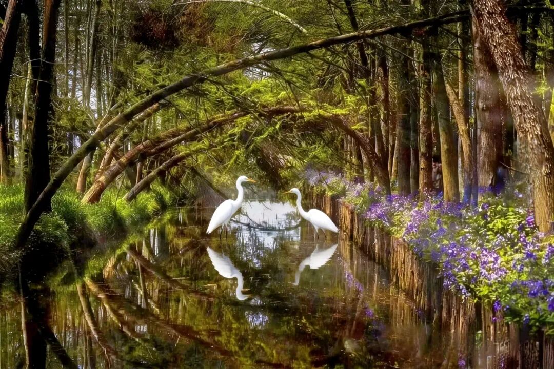 早起前往独特的“桥中有桥”双林三桥拍摄晨曦光影,可高空视角捕捉了远处文昌阁为点缀,将古老的万魁桥、化成桥、万元桥三座古石桥与河面其倒影交相辉映,日出的暖阳为河面镀上了一层金色辉煌,宛如一幅精美的画卷。清晨古镇的温暖与宁静,让人仿佛置身于那片宁静而壮丽的景色之中,感受到了大自然的魅力与美好。下午抵达“江苏省面积最大的人工生态林”李中水上森林拍摄(含门票),合理开发将荒滩开发成一条条垛格,栽种适应水中生长的池杉、水杉等树木品种,林中间种艿芋、油菜等经济作物。如今栽种的10万余株水杉、池杉等品种树木已长成高大茂密、生机盎然的水上园林,形成“河流回环、水杉林立、林中有水、水中有鱼、林内有鸟”的独特水乡景观。成行成列的杉树生长于垛田之上,水岸是一望无际的万亩杉林,散发着清凉静雅的气息,尤其是栖息着数万余只白鹭与杉林互衬成趣,蓝天、白云、绿树、飞鸟、倒影翩跹,光影流离,真是舟在水上走,人在画中游,杉林水韵令人沉醉其中,独一无二曲折的栈道将游人引入童话般的世界。住:兴化