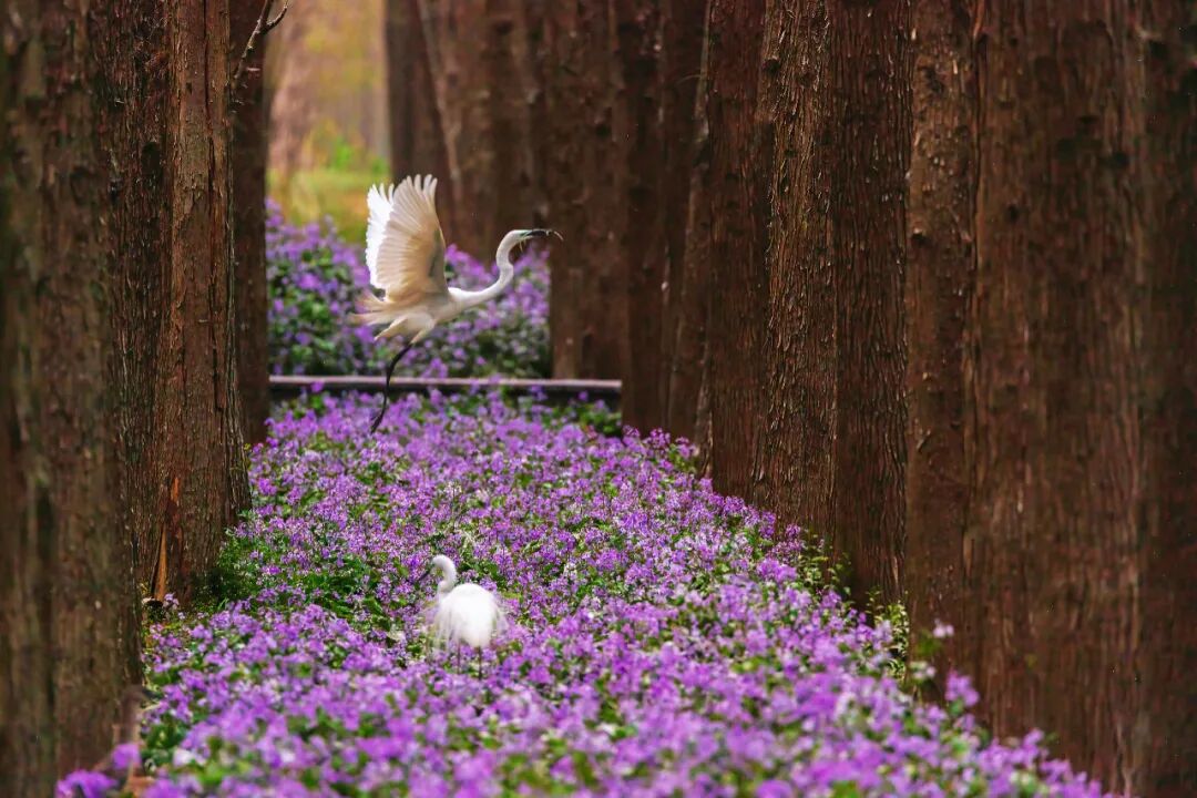 早起前往野鹿荡拍摄野麋鹿群,野鹿荡是一处面积达200公顷的滨海湿地,是地球上保存较为完好的原始湿地之一。暖春已至,生活在条子泥湿地的野生麋鹿也渐渐活跃起来,它们或成群的欢快追逐奔跑嬉戏,或低头觅食争斗,尤其是在广袤的滩涂上肆意奔跑,蹄飞跃过水面溅起泥水花,呦呦鹿鸣声悠悠回荡,给这片带湿地带来勃勃的生机,一幅“呦呦鹿鸣、食野之蒿”的诗意画面便铺陈开来。这里鸥水相依、鹿鸣呦呦,鸟鹿和谐的梦幻场景,令人神往。下午前往“江苏省面积最大的人工生态林”李中水上森林拍摄(含门票),合理开发将荒滩开发成一条条垛格,栽种适应水中生长的池杉、水杉等树木品种,林中间种艿芋、油菜等经济作物。如今栽种的10万余株水杉、池杉等品种树木已长成高大茂密、生机盎然的水上园林,形成“河流回环、水杉林立、林中有水、水中有鱼、林内有鸟”的独特水乡景观。成行成列的杉树生长于垛田之上,水岸是一望无际的万亩杉林,散发着清凉静雅的气息,尤其是栖息着数万余只白鹭与杉林互衬成趣,蓝天、白云、绿树、飞鸟、倒影翩跹,光影流离,真是舟在水上走,人在画中游,杉林水韵令人沉醉其中,独一无二曲折的栈道将游人引入童话般的世界。住:兴化